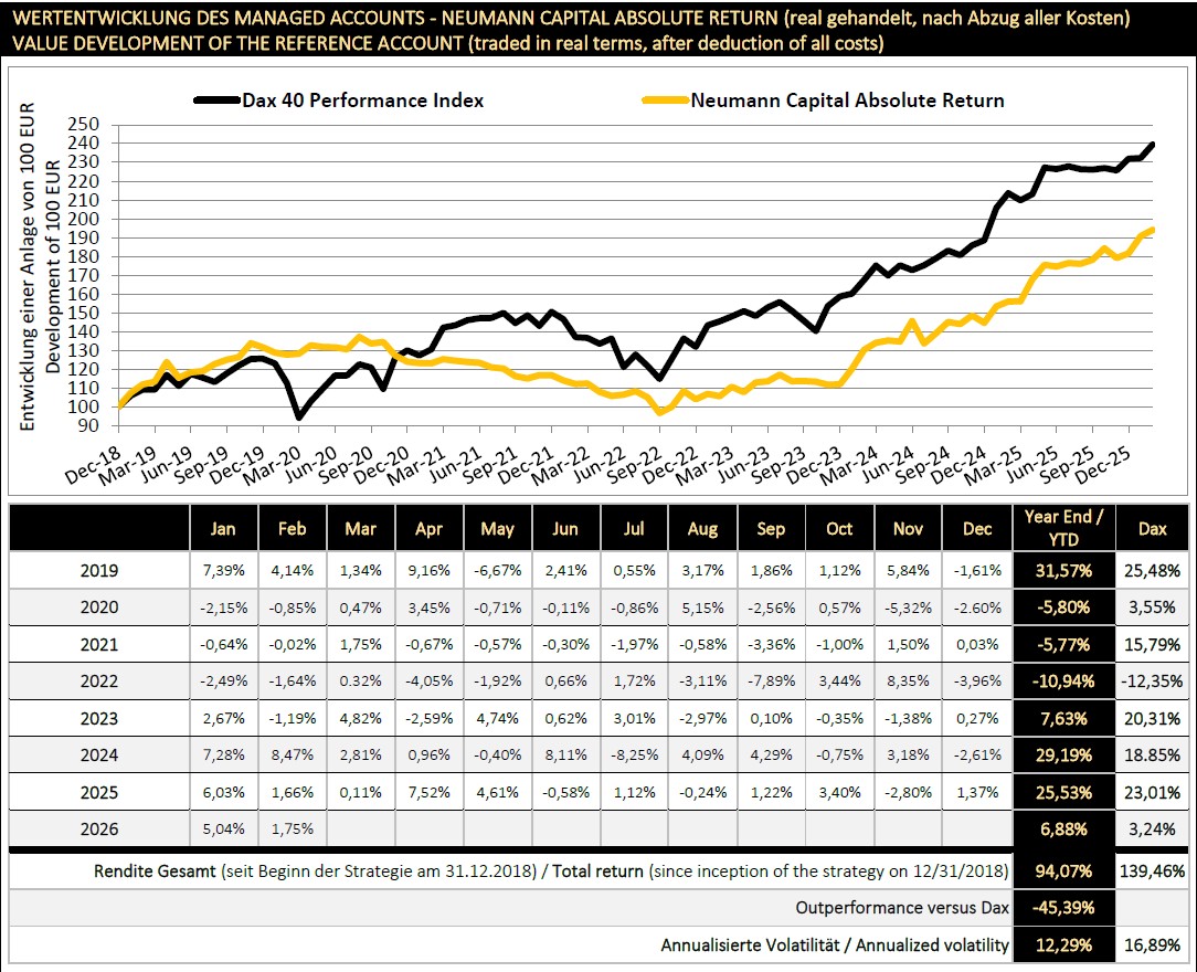 Unsere real gehandelte Portfoliostrategie „NEUMANN CAPITAL ABSOLUTE RETURN" (Managed Account auf eigene Rechnung) hat mehrere Alleinstellungsmerkmale.