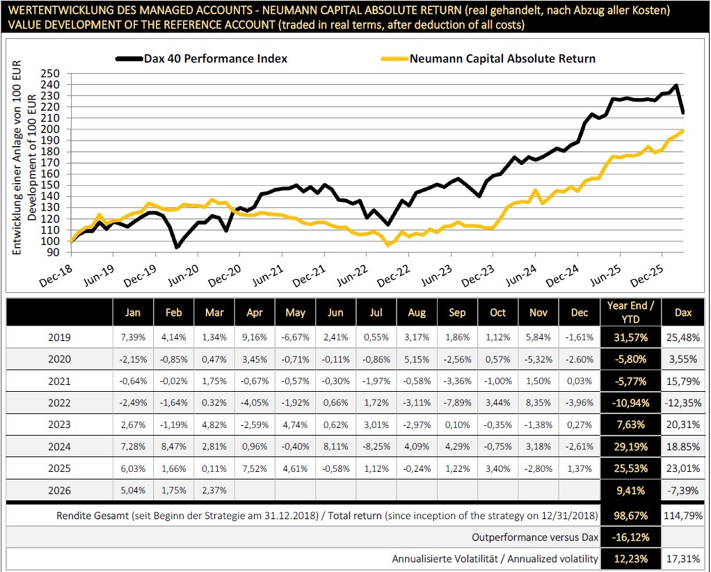 Unsere real gehandelte Portfoliostrategie „NEUMANN CAPITAL ABSOLUTE RETURN" (Managed Account auf eigene Rechnung) hat mehrere Alleinstellungsmerkmale.